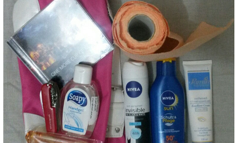 کرم دست، لوسیون ضدآفتاب، اسپری زیر بغل، ژل شستشوی دست، چاقوی چندکاره، مسواک و خمیردندان سفری. دستمال توالت هم که معرف حضور شماست. یکی دو تا سی دی هم دم دست میگذارم. مسیر سفر به اندازه مقصد سفر مهم است و قرار است از آن لذت ببریم.